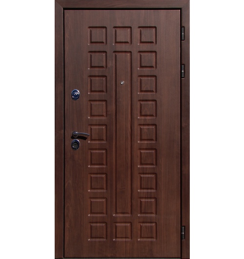 Внешняя сторона - МДФ панель 16 мм., покрыта плёнкой ПВХ - Винорит (данная плёнка позваляет устанавливать дверь в загородных домах, при прямом контакте с атмосферными явлениями), «Орех Кьяро»