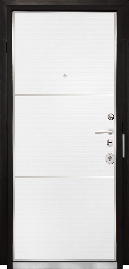 По умолчанию в базу 53 и 54 входит следующая фурнитура: задвижка, броненакладка, двойной контур уплотнения, порог с логотипом «Profildoors», утепление коробки, внутренний торец полотна по периметру из полированной стали, замок MOTTURA №54-797 задвижка, ручка. Дверной глазок вы можете заказать по желанию. Цвет фурнитуры - хром.